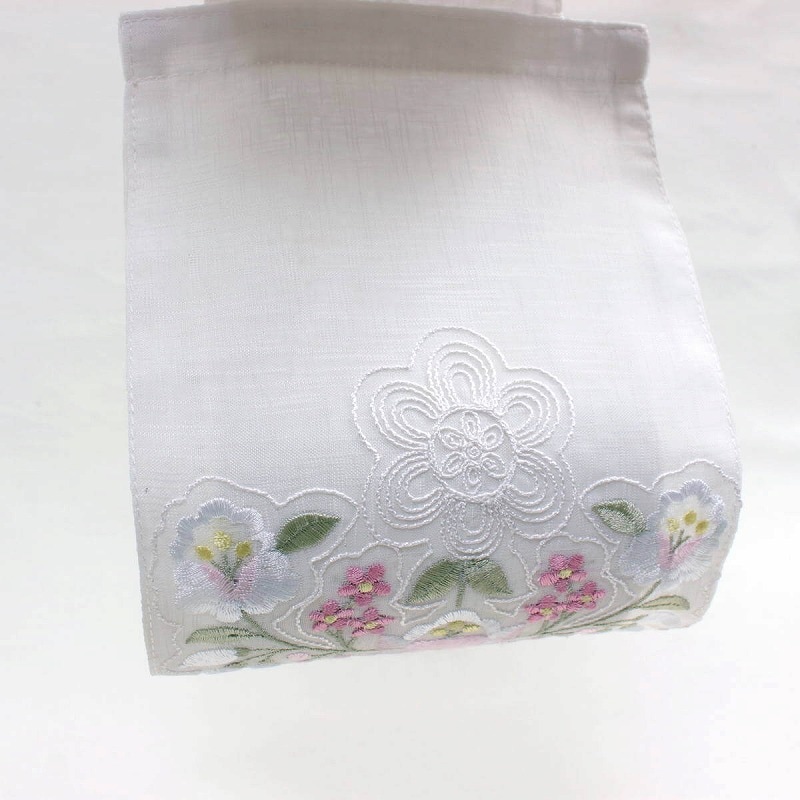 - 透明感あるオーガンジー生地にパステルカラーの糸で東欧のカロチャ調刺繍図案を施しました。清楚な雰囲気が特徴です。
