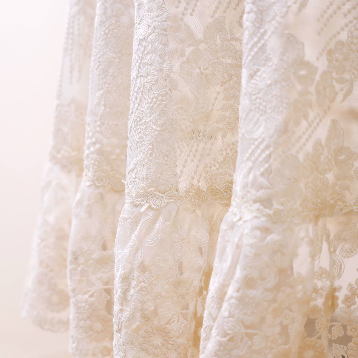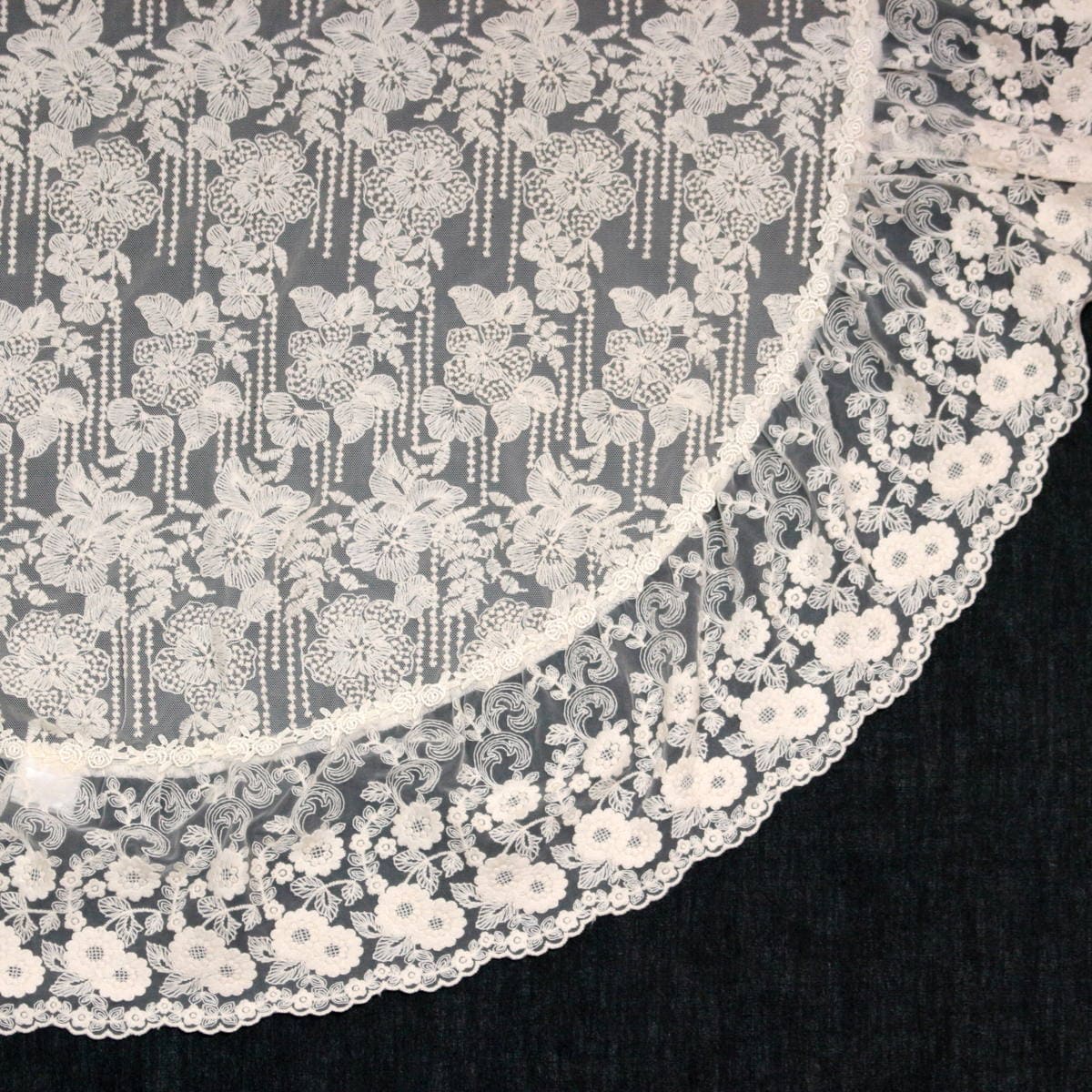 - 上品な透け感をもつチュールレースのテーブルクロス。コットン刺繍のチュールレース生地に刺繍レースのフリルを組み合わせた、贅沢なレース使いが特長です。